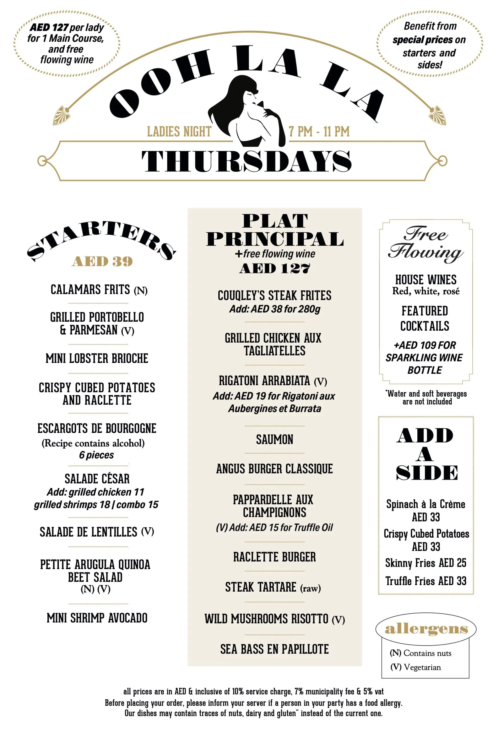 Enjoy two Couqley's signature Steak Frites, a bottle of grape, and a dessert for only AED 349! Need an extra bottle? No problem - just add AED 109 and you're on your way to madness!